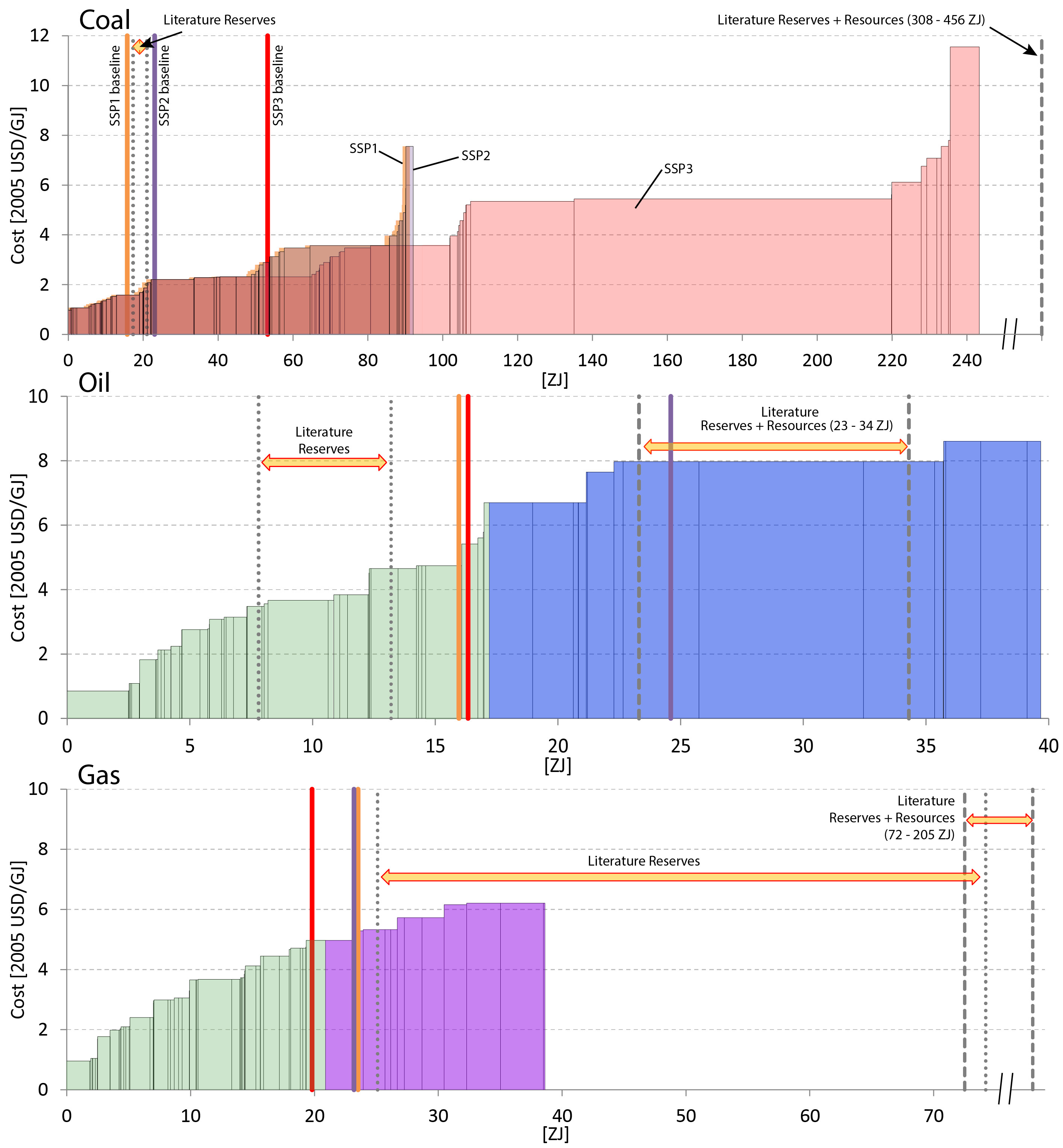 Fig. 4 presents the cumulative global resource supply curves for coal, oil and gas in the IIASA IAM framework. Green shaded resources are technically and economically extractable in all SSPs, purple shaded resources are additionally available in SSP1 and SSP2 and blue shaded resources are additionally available in SSP2. Coloured vertical lines represent the cumulative use of each resource between 2010 and 2100 in the SSP baselines (see the top panel for colour coding), and are thus the result of the combined effect of the assumptions on fossil resource availability and conversion technologies in the SSP baseline scenarios.