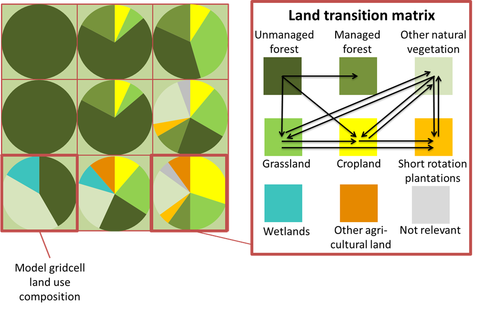 Fig. 22 Land cover representation in GLOBIOM and the matrix of endogenous land cover change possibilities (Havlik et al., 2014 [26]).